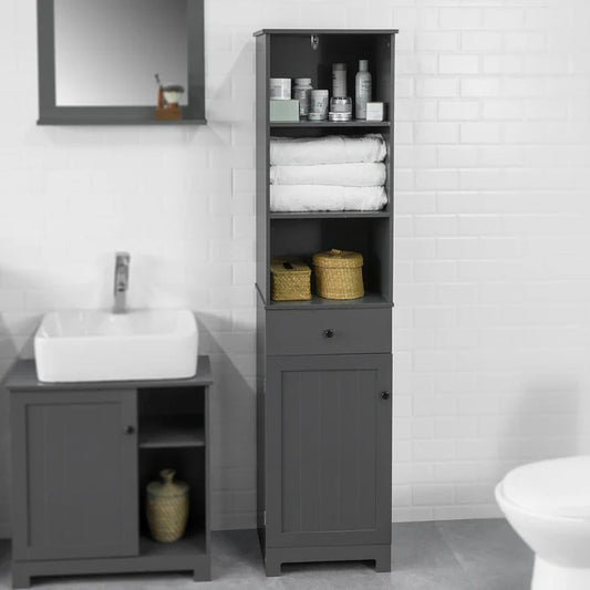 Badeværelsesskab - højt skab med skuffe, skab og åbne hylder, mørkegrå
