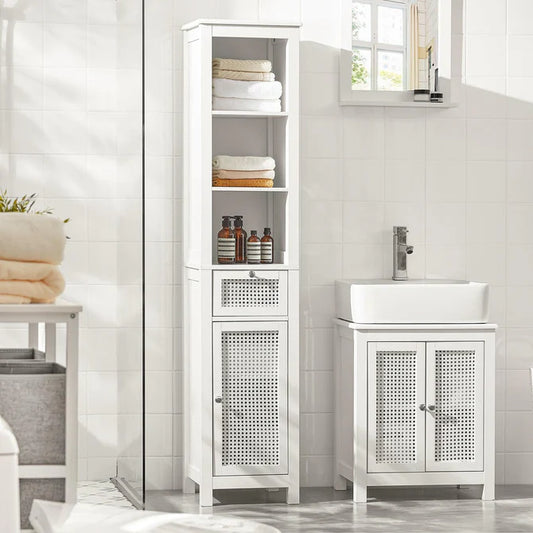 Badeværelsesskab - højt skab med skuffe, skab og åbne hylder, hvid
