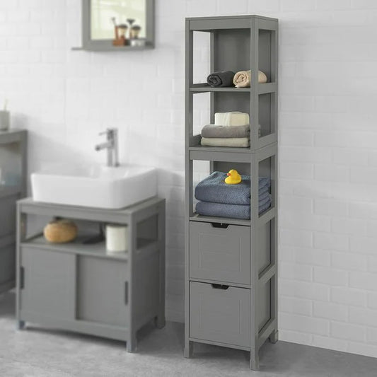 Pladsbesparende badeværelsesskab med 3 hylder og 2 skuffer, grå