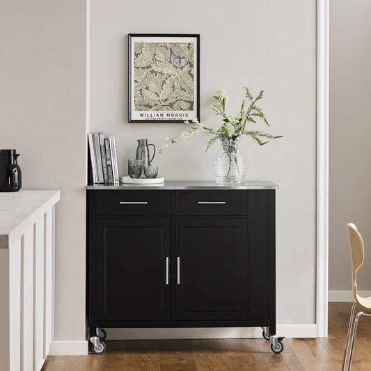 Køkkenvogn med træplade og 2 hylder / 2 skuffer, sort
