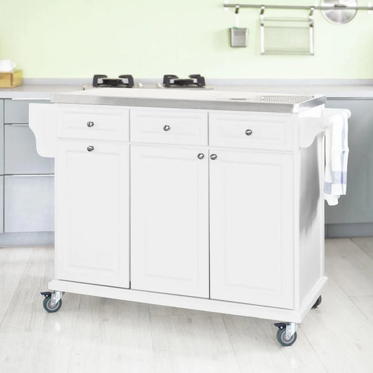 Køkkenø på hjul med flaskestativ og stålplade, hvid