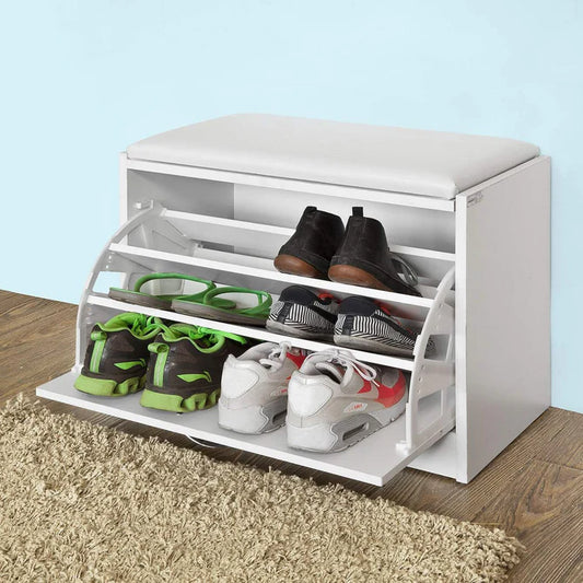 Skobænk med polstret sæde og vippeskuffe, hvid