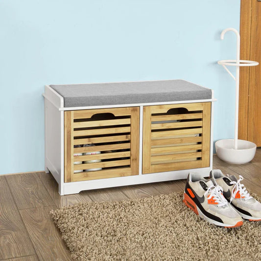 Skobænk med hynde og 2 store skuffer, grå / hvid