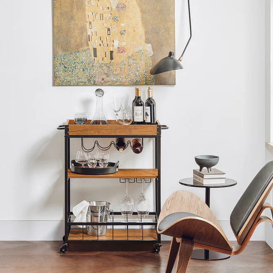 Køkkenvogn med flaskeholder og træ hylder, sort