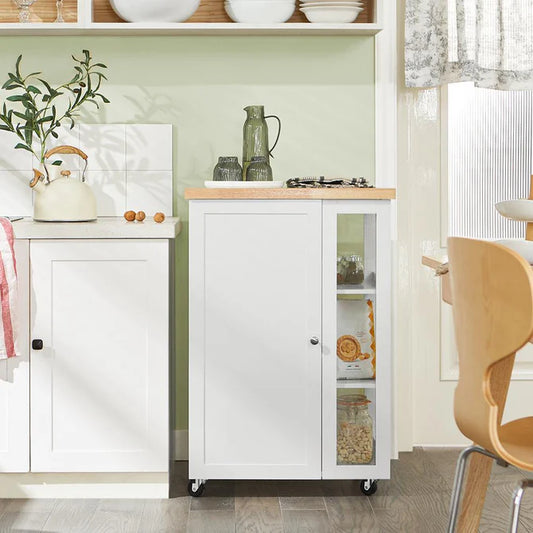 Køkkenvogn med træplade og flere opbevaringsmuligheder, hvid