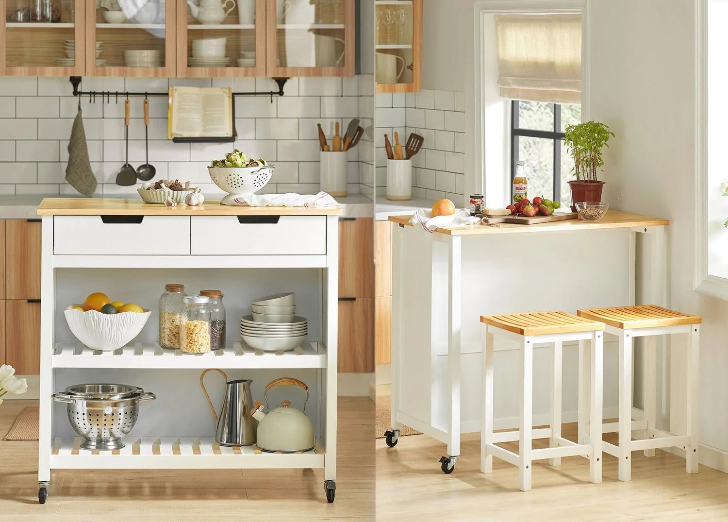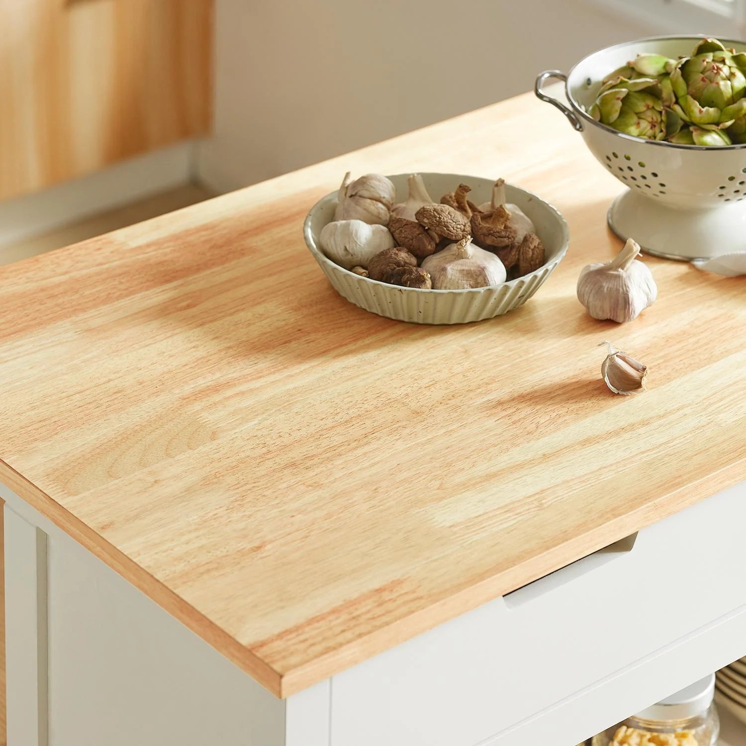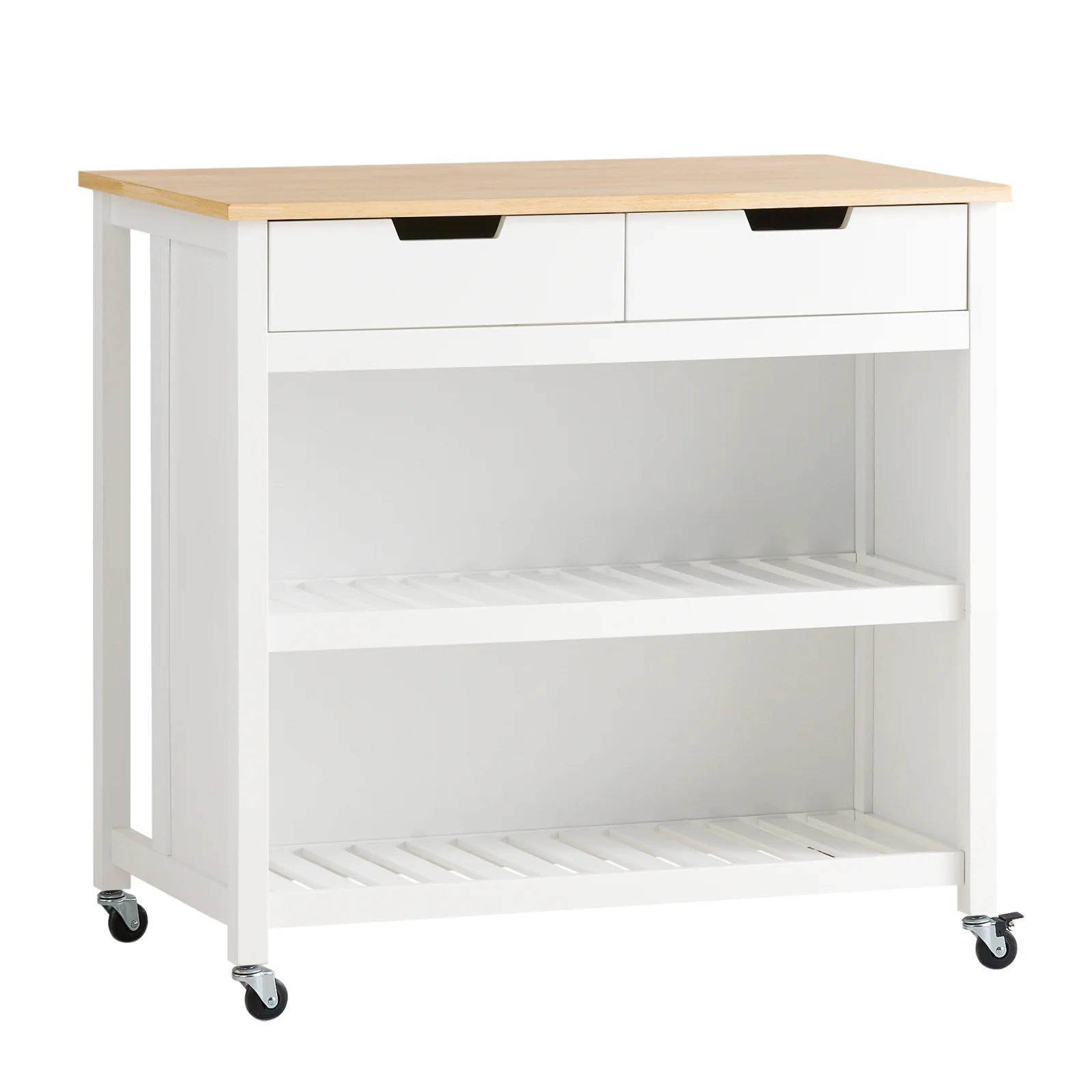 Køkkenvogn med træplade og 2 hylder / 2 skuffer, hvid