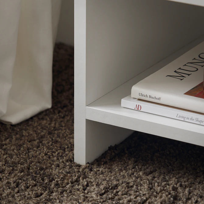 Lille sengebord med 2 hylder og 1 skuffe, hvid