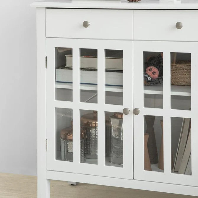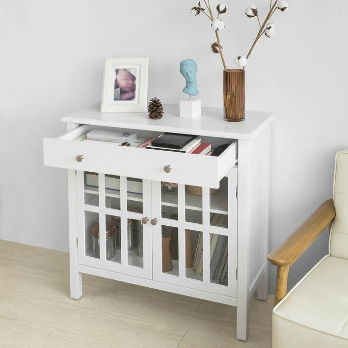 - Moderne skænk bestående af to hærdede glasdøre med indvendig hylde og en stor skuffe, praktisk og pladsbesparende