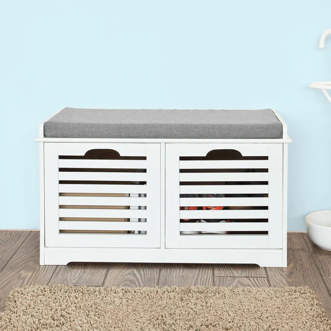 Skobænk med hynde og 2 store skuffer, grå / hvid