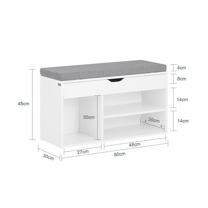 Skobænk med flere rum og hynde, hvid
