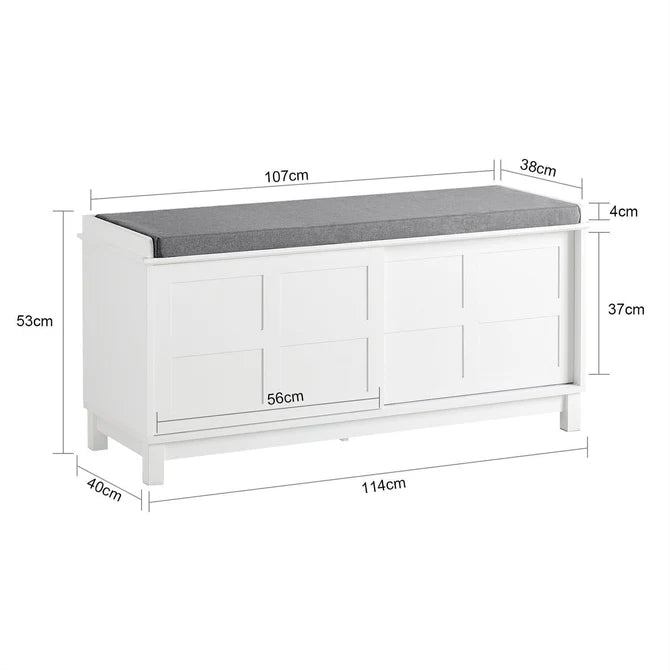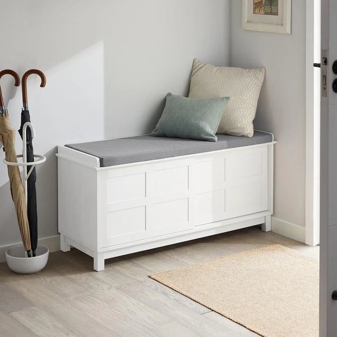 Bænk med 2 store opbevaringsrum og skydedøre, hvid
