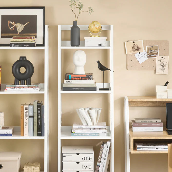 Denne moderne stigehylde er enestående takket være dens patenterede design. Den kan bruges som en simpel stigehylde eller som et originalt pladsbesparende skrivebord.