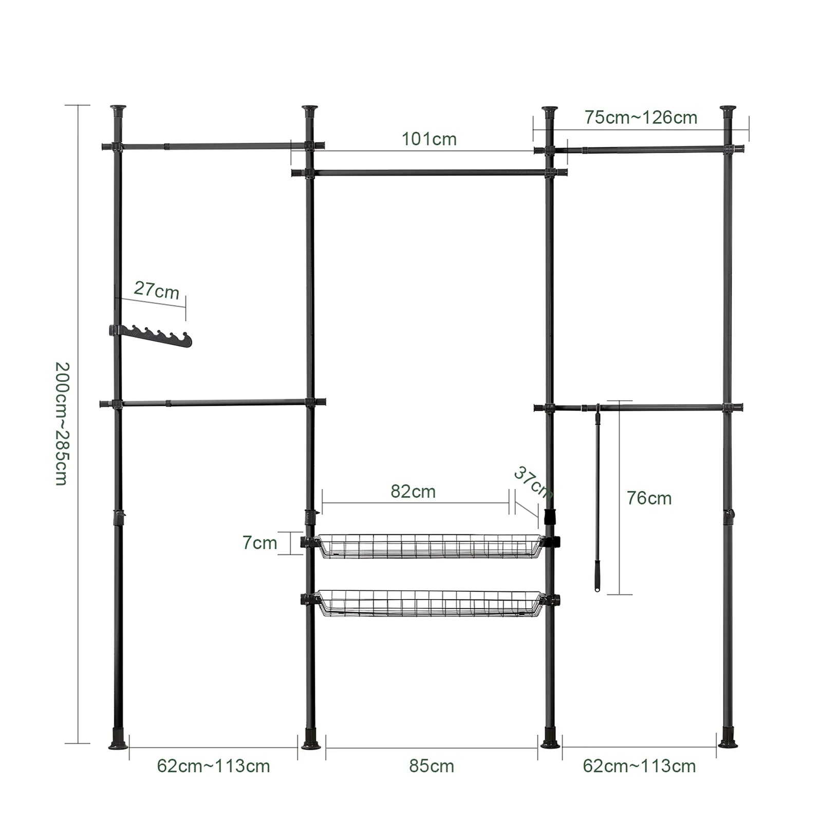 - Justerbar højde: 200 ~ 270 cm; Længde: 75~122 cm + 85 cm + 75~122 cm,